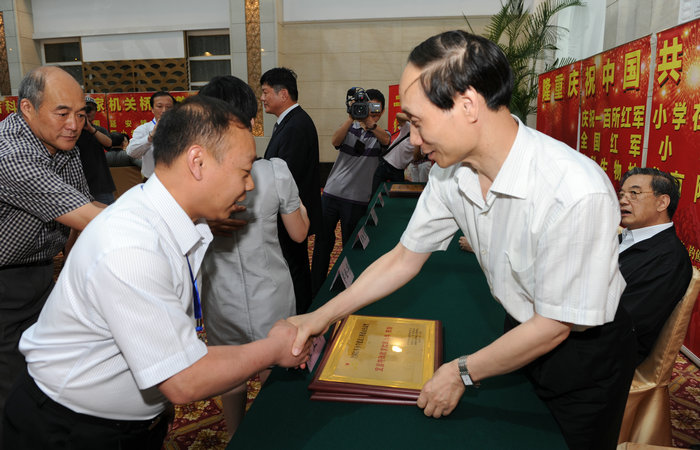 全国红军小学建设工程理事会副理事长兼秘书长方强同志(左一)为学校授“全国五星级红军学校”牌