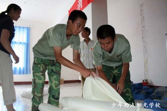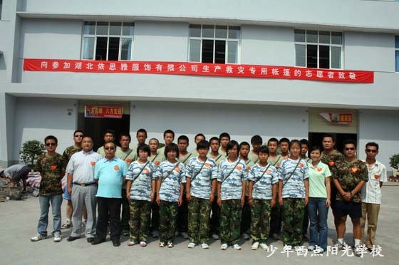 6月6日下午2点30分,少年西点阳光学校20名学员志愿者在陈锋校长、周纯荣书记、辛进锋处长的带领下,从学校出发乘车赶往宜昌市一家民政救灾帐篷生产企业做义工,为灾区群众能早点有个遮风避雨的地方做一点力所能及的事情,以他们的实际行动奉献自己的爱心。