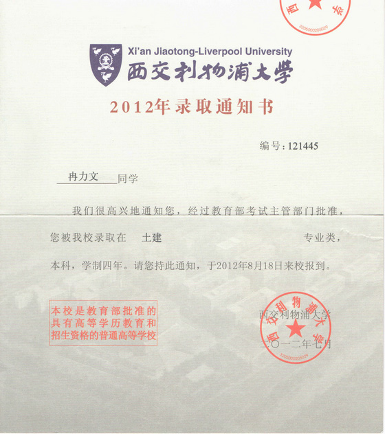喜报——我校毕业生冉力文被西交利物浦大学录取