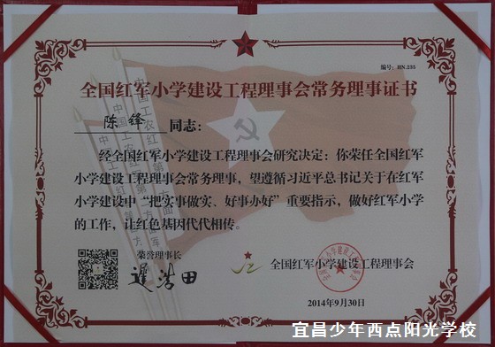 全国红军小学建设工程理事会副理事长兼秘书长方强同志为陈锋校长颁发证书
