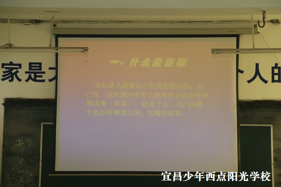 戚教授讲课一开始,就说在新的一年里要做的事情很多,如要改变过去不良行为习惯和不良表现,等等。但戚教授说要做的事情再多,简单概括起来就两个字“学习”,学做人,学科学文化知识。因此,戚教授在课里讲解了新年新目标,要求同学们在新一年里自己给自己规定一个新目标。许多同学们很有感触和深受启发,纷纷表达了新一年的新目标。只要我们有了生活和奋斗的新目标,便会有前进的动力。我们做人就是要这样,不断树立目标,然后努力实现目标,这样,我们的人生才会过得充实,才不会整天无所事事,虚度光阴。父母把大家送到宜昌少年西点,想让这里的生活改变自己,其实,想要真正的改变自我,还是要靠大家自己去想,去做,这样,才能从骨子里去改变,成为一个崭新的自己。戚教授告诉同学们。“现在唯一能做的便是在西点过好每一天的生活,好好训练,用一个好的心态去面对一切困难、挫折,从中吸取教训,得到成长,以致心灵上得到净化,从根本上得到改变。”但对于现在的同学们来说,目标就是完成教员布置的所有任务,在每次的体能训练中坚持下来,然后不断提升自我,改正自身不足,尽早回家恢复学业。