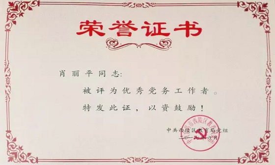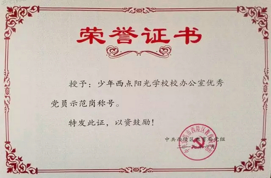 中共西陵区教育局党组授予宜昌少年西点阳光学校“校办公室优秀党员示范岗”称号,我校陈锋同志被评为优秀共产党员,肖丽平同志被评为优秀党务工作者。(通讯员:熊凯)