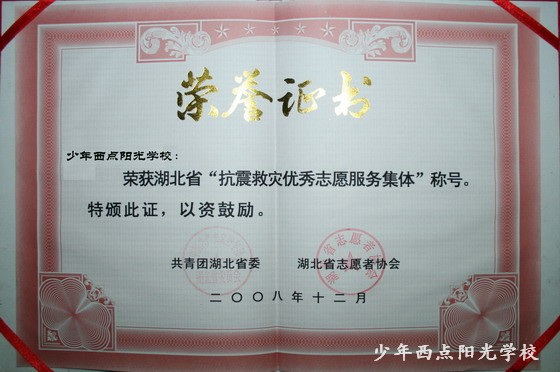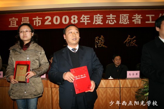 2008年12月29日下午,宜昌市2008年度志愿者工作表彰大会在彝陵饭店隆重召开,宜昌市委常委、宣传部长赵举海同志,宜昌市市长助理、市政府秘书长马学军同志等市委、市政府领导,以及共青团宜昌市委、宜昌市志愿者协会的主要领导出席了表彰大会。会议表彰了“宜昌市十大杰出志愿服务集体”和“宜昌市十大杰出志愿者”等先进集体和个人。我校被湖北省评为“抗震救灾优秀志愿服务集体”,陈锋校长代表学校参加了会议并领取了由共青团湖北省委和湖北省志愿者协会联合颁发的荣誉证书。