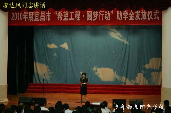 陈锋校长办学十四年来,特别是在择差教育领域取得了辉煌的成绩,在他事业成功的同时没有忘记回报社会,他曾多次为希望工程、灾区、贫困学生以及新农村建设捐款献爱心。今年陈校长又资助了五名贫困大学生,其中包括一名考取清华大学的学生,帮助他们解决了学费问题。8月30日下午3时,陈锋校长出席了2010年宜昌“希望工程·圆梦行动”助学金发放仪式。该仪式由共青团宜昌市委书记任蔚同志主持,宜昌市委常委、市统战部部长廖达凤同志出席仪式并发表讲话,参加仪式的还有宜昌市政府副市长邓恢林同志等。仪式上宜昌市委常委、市统战部部长廖达凤同志为我校颁发了“希望工程·圆梦行动”爱心企业牌。仪式结束后,陈锋校长和资助的五名学生见了面并鼓励他们要好好学习,将来回报社会。