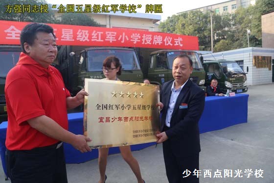 中共中央办公厅机关原党委副书记、人事局原副局长、全国红军小学建设工程理事会副理事长李永平同志、全国红军小学建设工程理事会副理事长兼秘书长方强同志、北京市公安局正处局干部、全国红军小学建设工程理事会常务理事黄中芳同志、宜昌市西陵区政府副区长刘祖华同志、宜昌市西陵区教育局副局长李红杨同志等出席了授牌仪式。仪式上,李永平同志宣读了我校被授予“五星级红军学校”的决定,决定中高度评价了我校把红色教育纳入到学校的德育教育之中所取得的突出成果。方强同志给我校授“五星级红军学校”牌匾,并给我校校长陈锋、秭归夏明翰红军小学校长谭国军两名同志颁发了“红军小学优秀校长”荣誉证书。
